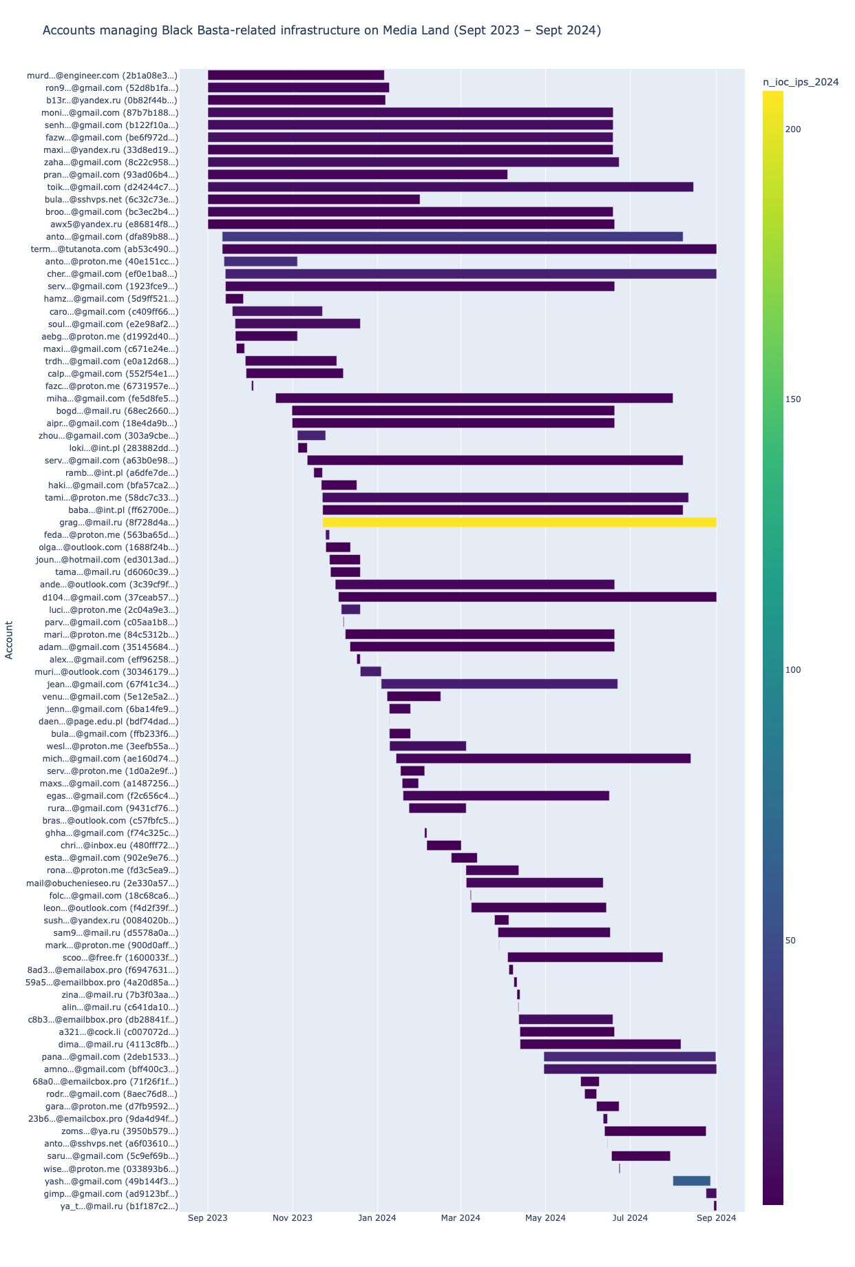 Of course, this does not immediately mean that we found all the Black Basta criminals and can now send them emails. In total, scouring the leak for these IPs produced a list of 74 distinct user accounts whose assigned IPs between September ‘23 and ‘24 overlap with the Black Basta IOC list. Most of these accounts only have a handful of matches (one or two IPs), which is consistent with Black Basta being Ransomware-as-a-Service. Therefore, it could be that Media Land also had some Black Basta affiliates on their networks. More importantly, however, is the detail of the account with the largest footprint having the account name “Mister Reseller”. Thus, it could as well be that these accounts are acting as a reseller to Black Basta, brokering access to the Media Land infrastructure. As Figure 4 shows, there is one account that stands out in terms of footprint.
