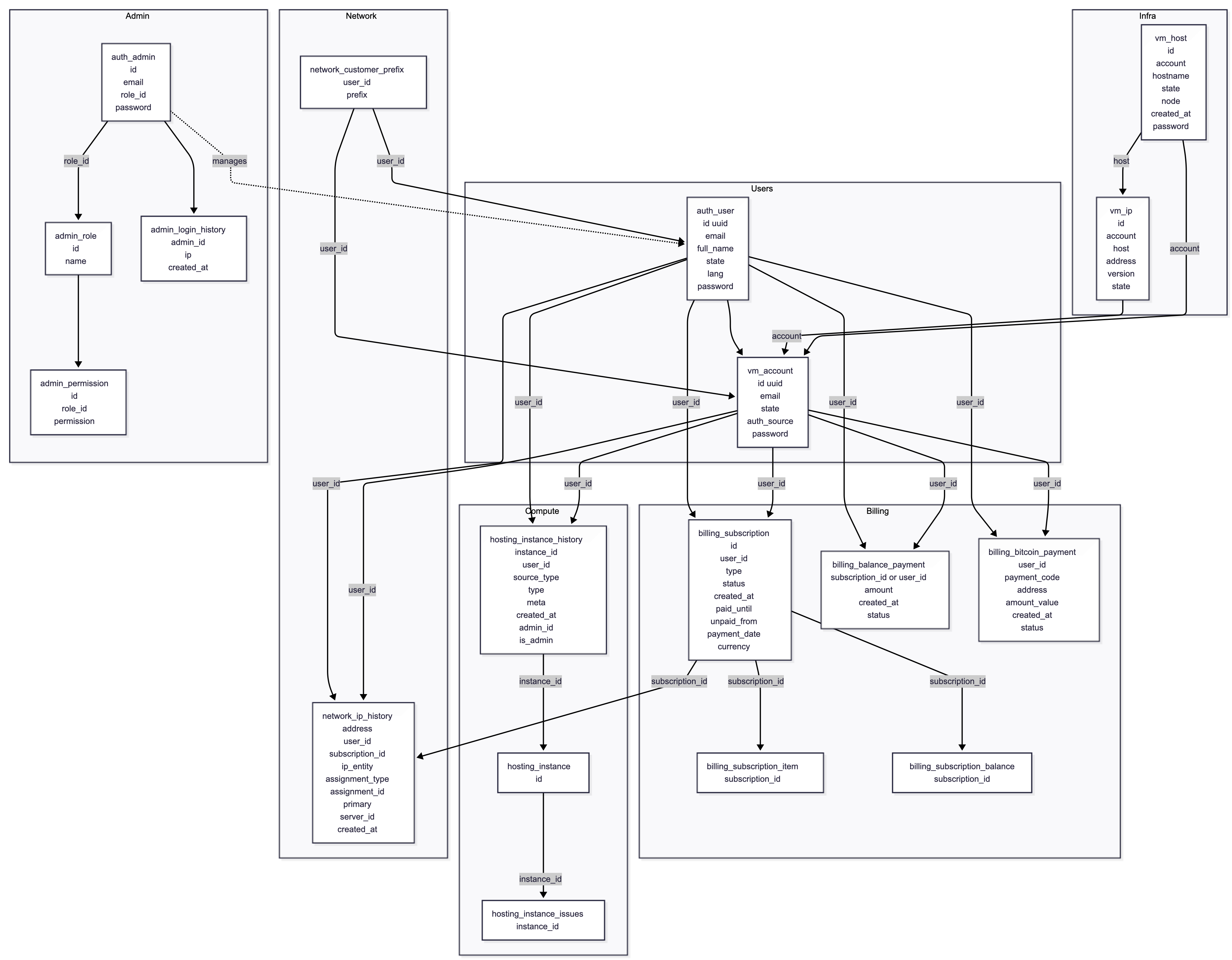 The infrastructure layer covers the physical or virtual host nodes and the addresses routed to them. The vm_host table lists the compute nodes that run customer VMs. vm_ip represents individual addresses assigned on those nodes, including their address, IP family, and the account to which they were bound. This layer sits closest to the boundary between customer behaviour and internal operations, because it reflects real resource consumption and routing-level behaviour.