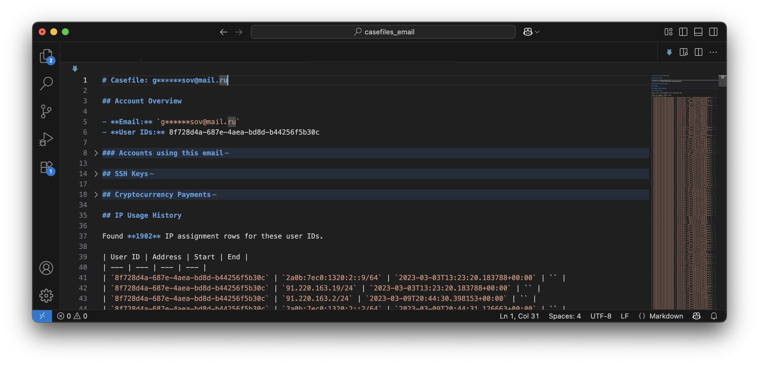 With the profiles in place, we can finally look at how different actors behaved inside Media Land’s infrastructure: who used large amounts of IP space, how email and payment patterns clustered, and where SSH key reuse ties seemingly separate accounts together. These findings are of course not claims about intent, but observations about how infrastructure was used within the platform. For the same reason, I will not include any full email addresses and PII in this post but will partially redact them instead. The full details remain confined to the research environment.