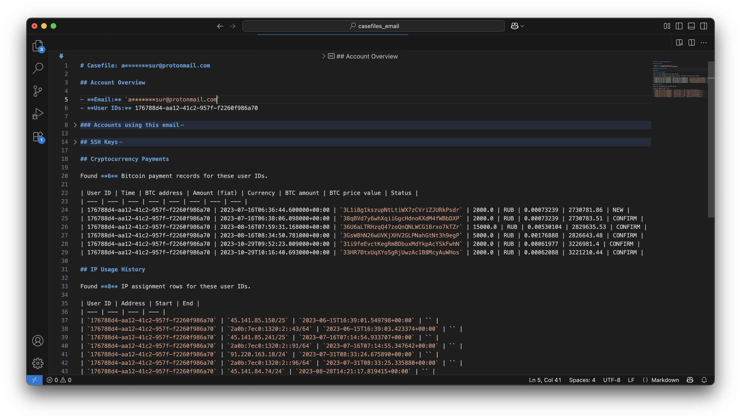 The logic is straightforward: start at the user id, pivot to the user_user table and locate the account tied to the user id, then do the same for any cryptocurrency billing, virtual machines, and IP assignments. This allows us to read the dataset not as a collection of tables, but as longitudinal traces of individual resource users.